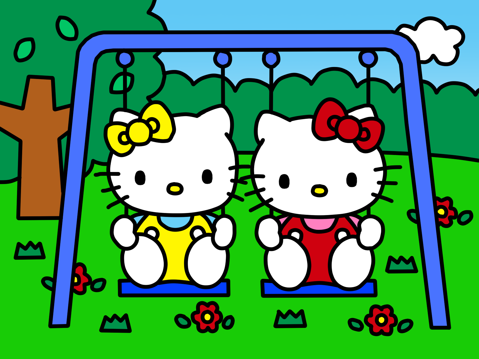 Hello kitty and mimmy coloring pages. Mimmy is Hello Kittys twin sister and playmate. George White and twin sister Mimmy. Swings with Hello Kitty and Mimmy coloring page printable game.